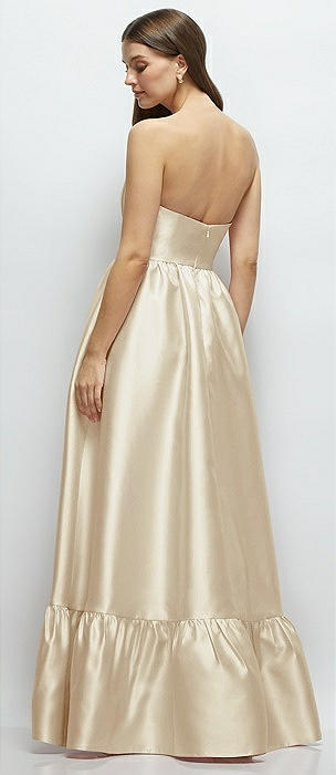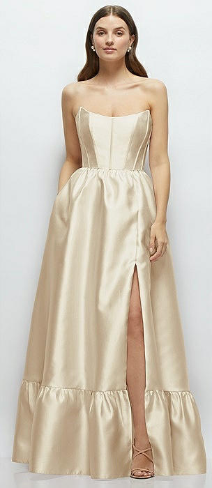 Strapless Cat-Eye Boned Bodice Maxi Dress with Ruffle Hem in champagne