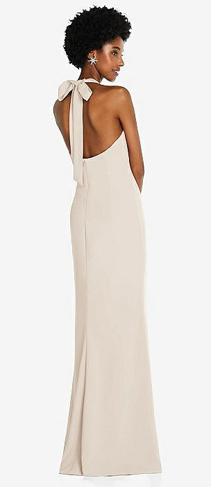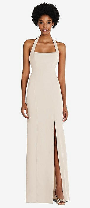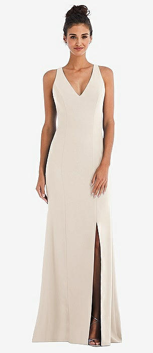 Notch Crepe Trumpet Gown with Front Slit in oat