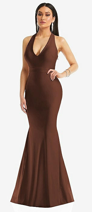 High Neck Backless Maxi Dress with Slim Belt in toasted sugar