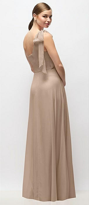 Basque-Neck Satin Column Maxi Dress with Off-the-Shoulder Bows in cognac