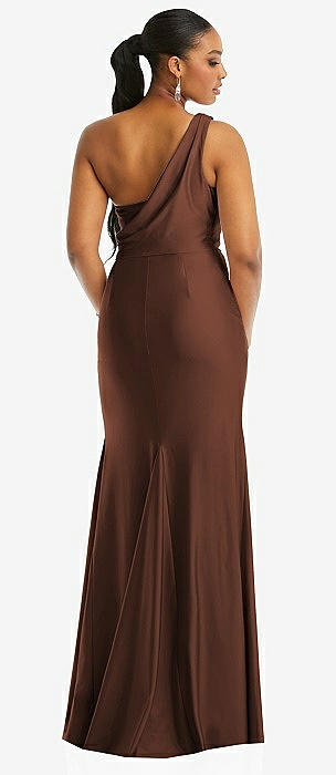 One-Shoulder Asymmetrical Cowl Back Stretch Satin Mermaid Dress in cognac