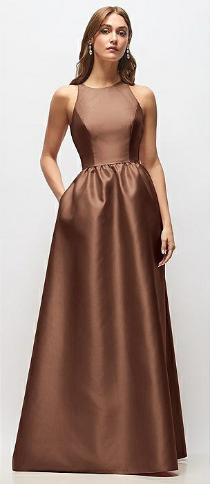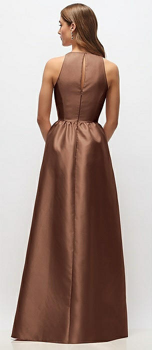 Jewel Neck Halter Full A-Line Satin Maxi Dress in cognac