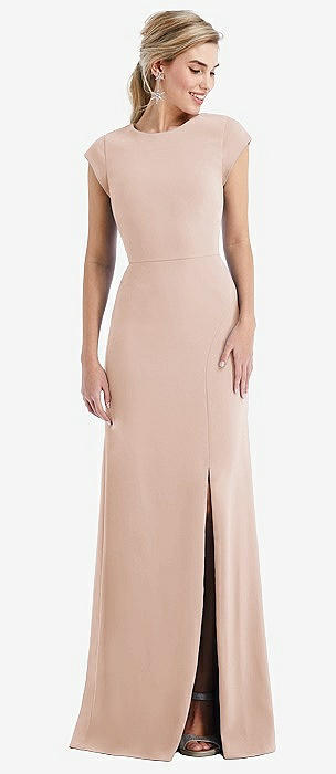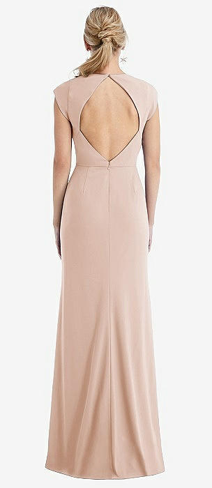 Cap Sleeve Open-Back Trumpet Gown with Front Slit in cameo