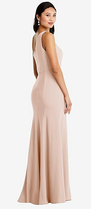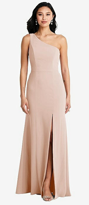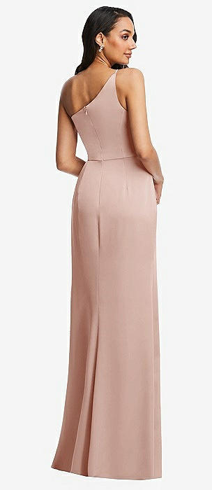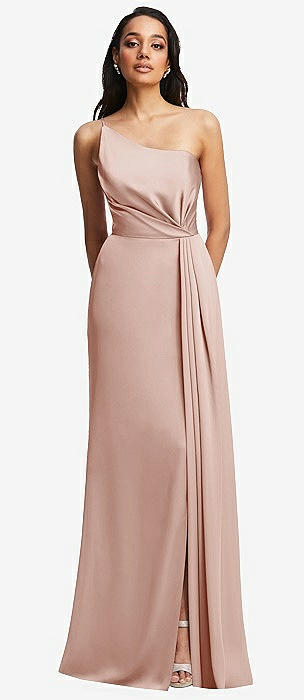 Draped One-Shoulder Satin Trumpet Gown with Front Slit in cameo