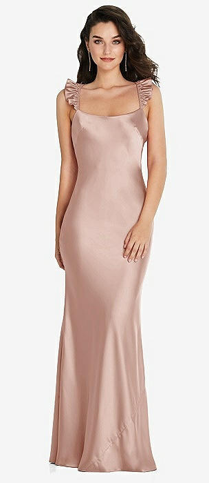 Ruffle Trimmed Open-Back Maxi Slip Dress in toasted sugar