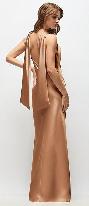 Draped Scarf One-Shoulder Bias Stretch Satin Maxi Dress in toffee