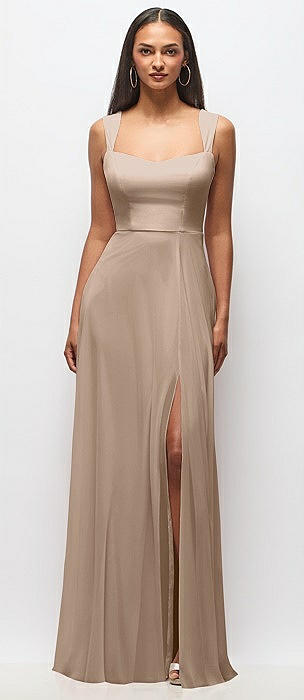 Square-Neck Satin A-line Maxi Dress with Front Slit in toffee