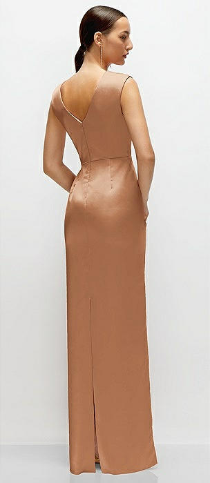 Strapless Satin Column Dress with Back Slit in cognac