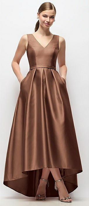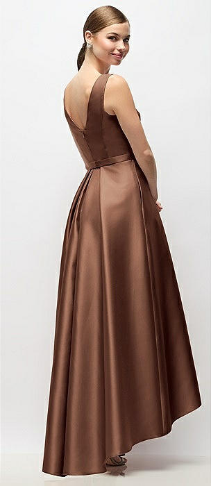 Sleeveless Pleated Skirt High Low Dress with Pockets in cognac