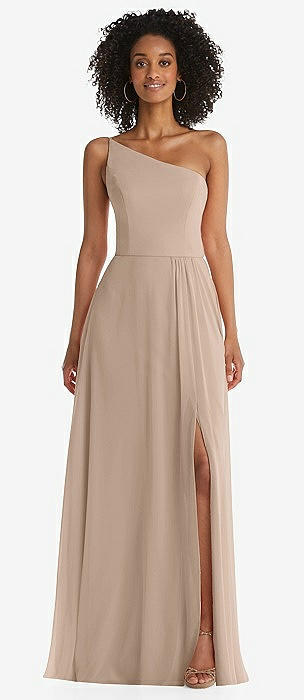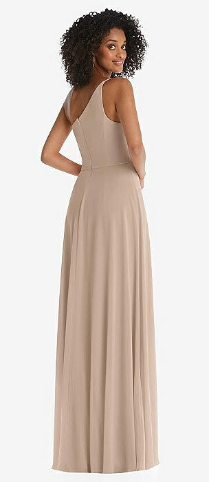 One-Shoulder Chiffon Maxi Dress with Shirred Front Slit in topaz