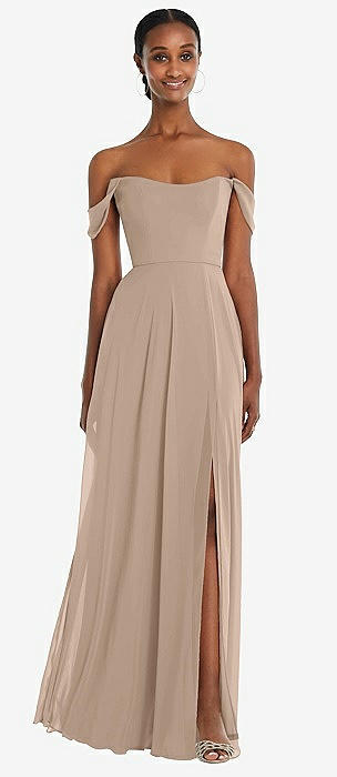 Off-the-Shoulder Pleated Cap Sleeve A-line Maxi Dress in cameo