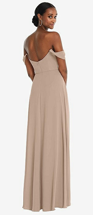 Off-the-Shoulder Corset Stretch Satin Mermaid Dress with Slight Train in cognac