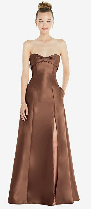Jewel Neck Bowed Open-Back Trumpet Dress with Front Slit in cognac