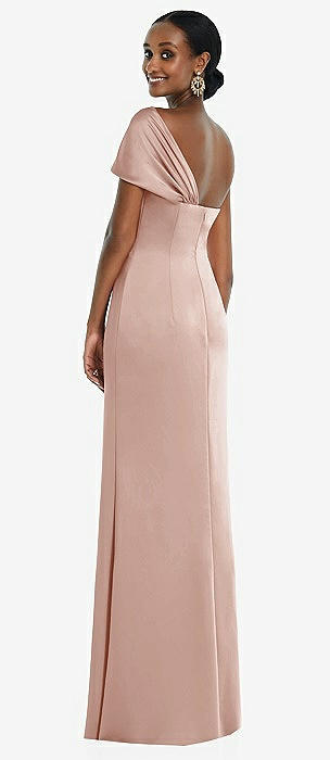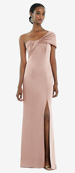 Draped One-Shoulder Satin Trumpet Gown with Front Slit in cameo
