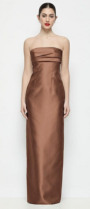 Strapless Pleated Empire Satin Column Maxi Dress in cognac
