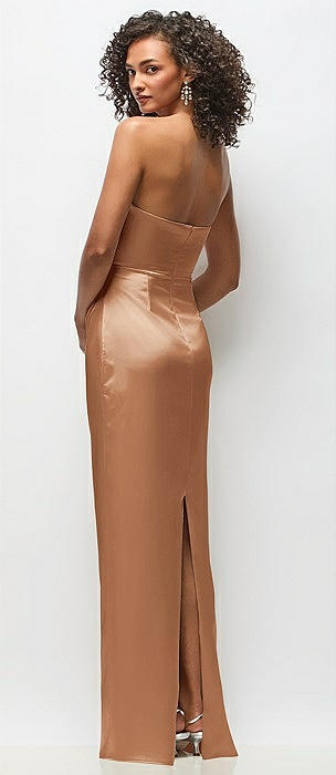 Strapless Draped Bodice Stretch Satin Column Maxi Dress in toffee