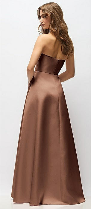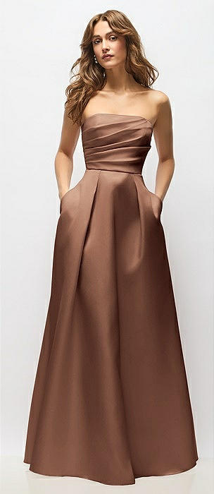 Strapless Bias Cuff Bodice Satin Gown with Pockets in cognac