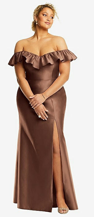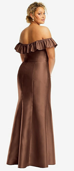 Off-the-Shoulder Ruffle Neck Satin Trumpet Gown in cognac