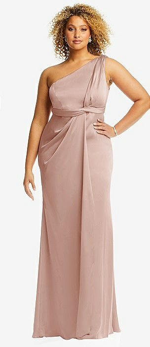 One-Shoulder Draped Twist Empire Waist Trumpet Gown in toasted sugar