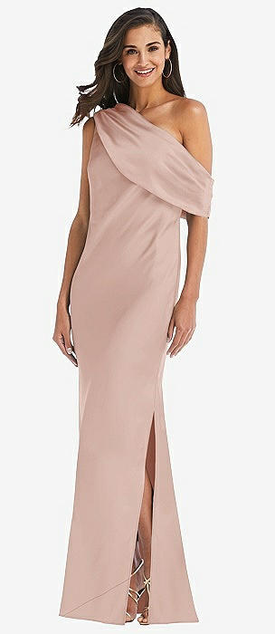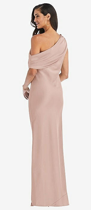 Draped One-Shoulder Convertible Maxi Slip Dress in toasted sugar