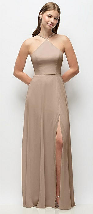 High-Neck Halter Stretch Satin Maxi Dress with Bias A-line Skirt in toffee