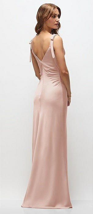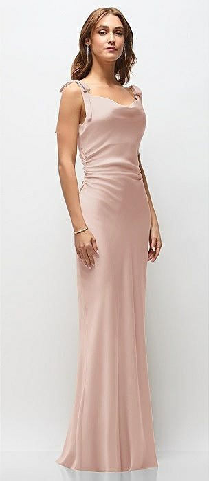 Soft Cowl Neck Ruched Side Satin Bias Maxi Dress with Shoulder Bows in toasted sugar