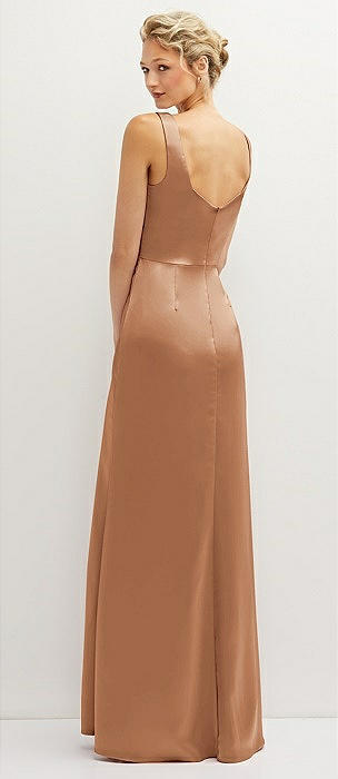 Square-Neck Satin A-line Maxi Dress with Front Slit in toffee
