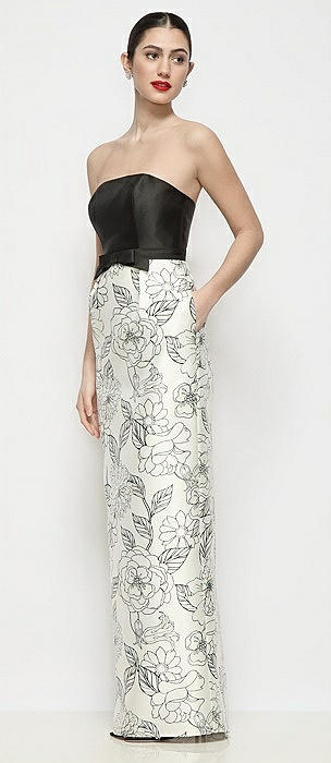 Strapless Satin Maxi Dress with Black and White Floral Column Skirt in black / botanica