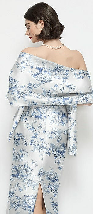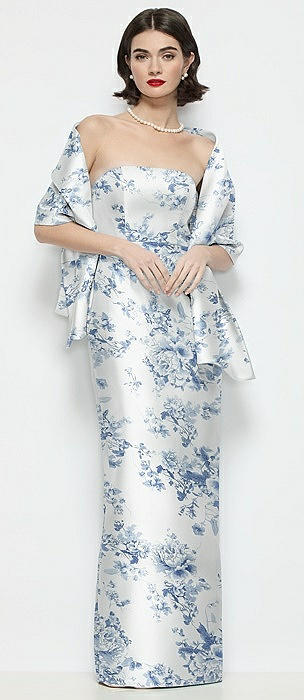 Strapless Cuff Neck Floral Satin Maxi Dress with Column Skirt in bow and blossom print