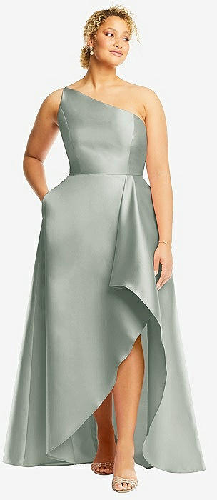 One-Shoulder Satin Gown with Draped Front Slit and Pockets in willow green