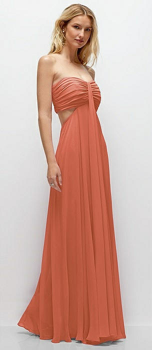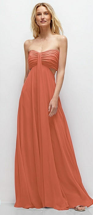 Strapless Empire Waist Cutout Maxi Dress with Covered Button Detail in terracotta copper