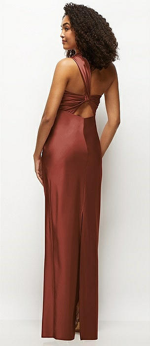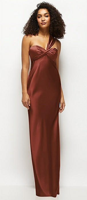 Satin Twist Bandeau One-Shoulder Bias Maxi Dress in auburn moon
