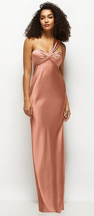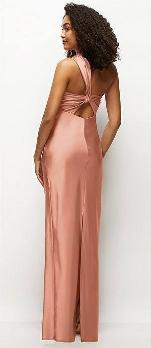 Satin Twist Bandeau One-Shoulder Bias Maxi Dress in copper penny
