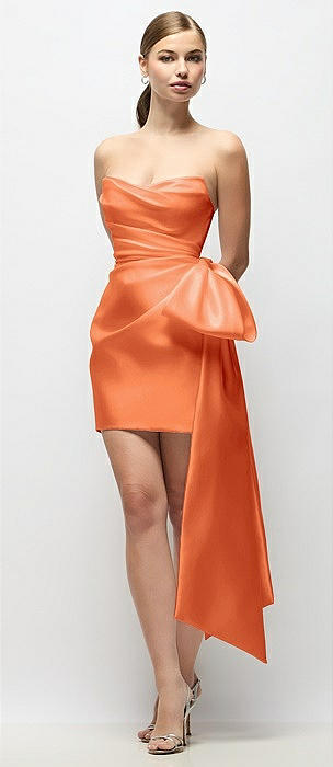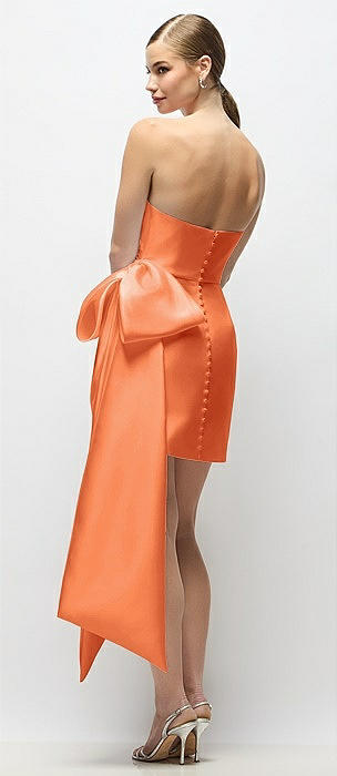 Strapless Pleated Draped Satin Mini Dress with Dramatic Long Tail Bow & Covered Buttons