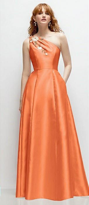 One-Shoulder Full A-Line Satin Gown with Handworked Floral Appliqué in portofino orange