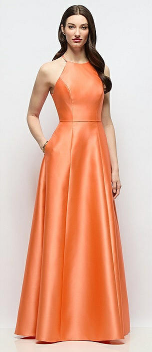 Jewel Neck Halter Full A-Line Satin Maxi Dress in portofino orange