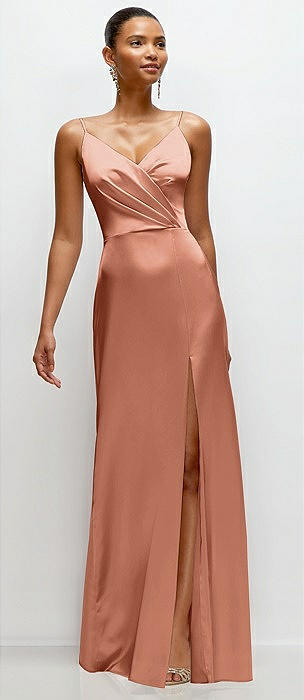 Pleated Faux Wrap Satin Maxi Dress with Adjustable Spaghetti Straps in copper penny