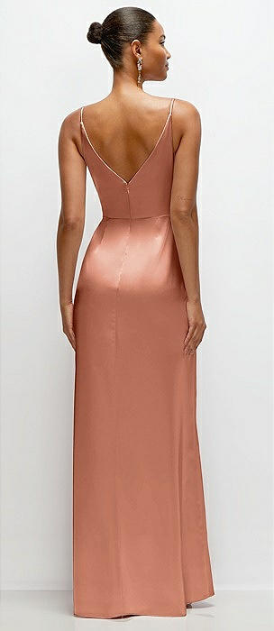 Asymmetrical Cuff Neck Stretch Satin Bias Maxi Dress with Adjustable Spaghetti Straps in copper penny