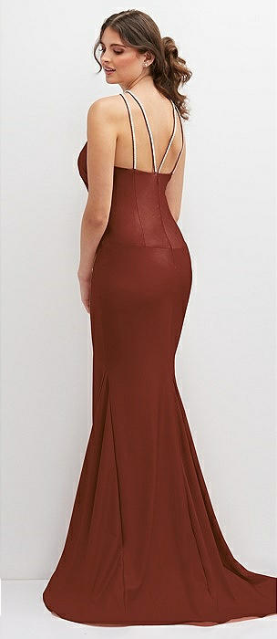 Halter Asymmetrical Draped Stretch Satin Mermaid Dress with Rhinestone Straps in auburn moon