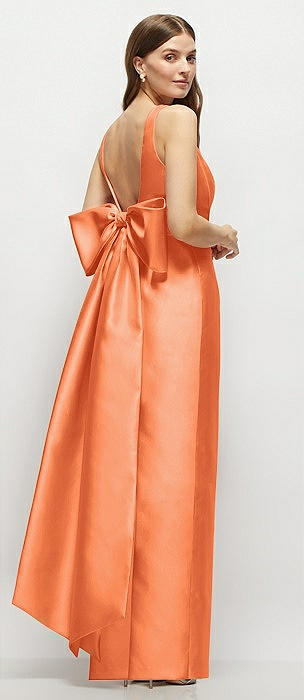 Deep V-back Satin Trumpet Dress with Cascading Bow at One Shoulder in portofino orange