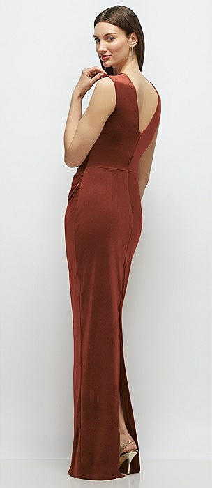High-Neck Cap Shoulder Pleated Bodice Velvet Column Maxi Dress in auburn moon