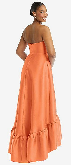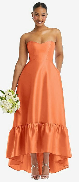 Strapless Deep Ruffle Hem Satin High Low Dress with Pockets in portofino orange