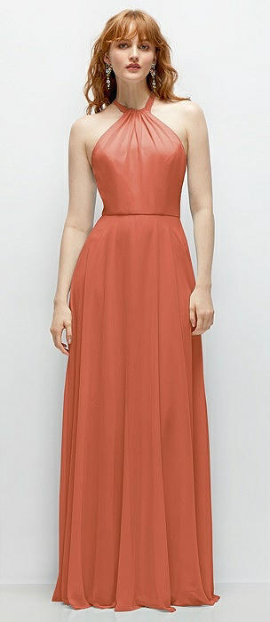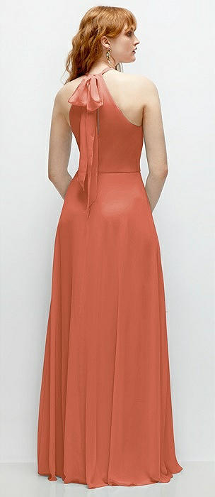 Shirred Halter Chiffon Maxi Dress with Back Sash-Tie Closure in terracotta copper
