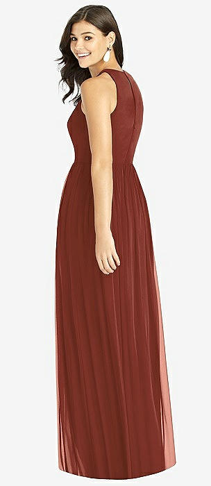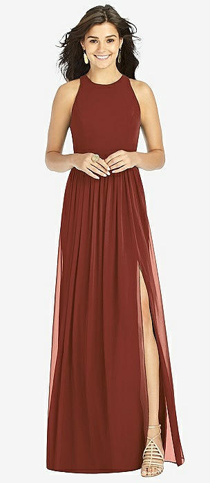 Shirred Skirt Jewel Neck Halter Dress with Front Slit in auburn moon