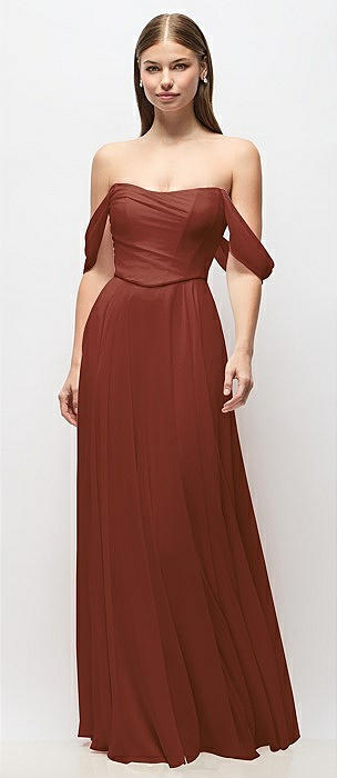 Off-the-Shoulder Basque Corset Chiffon Maxi Dress in auburn moon