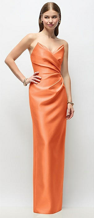 Strapless Asymmetrical Draped Satin Column Maxi Dress in portofino orange