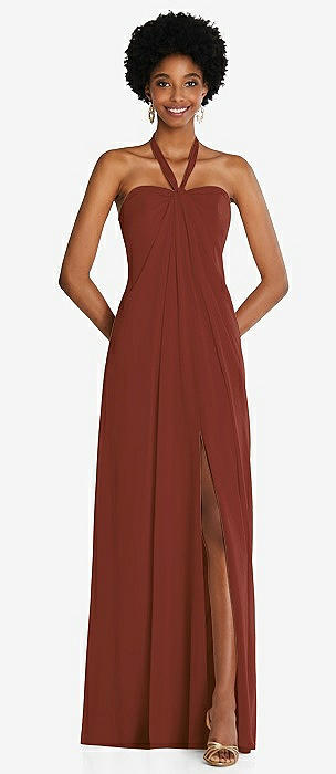 Shirred Skirt Jewel Neck Halter Dress with Front Slit in auburn moon