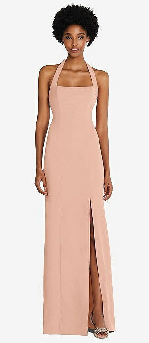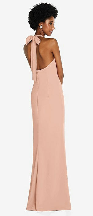 Tie Halter Open Back Trumpet Gown in pale peach