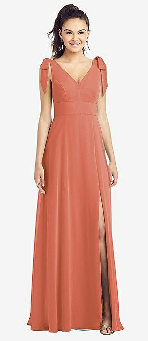 Bow-Shoulder V-Back Chiffon Gown with Front Slit in terracotta copper
