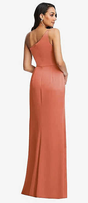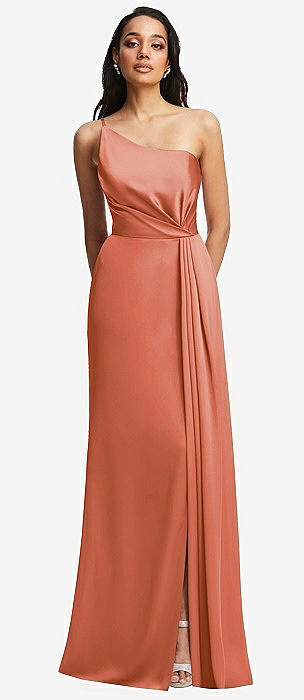 One-Shoulder Draped Skirt Satin Trumpet Gown in terracotta copper